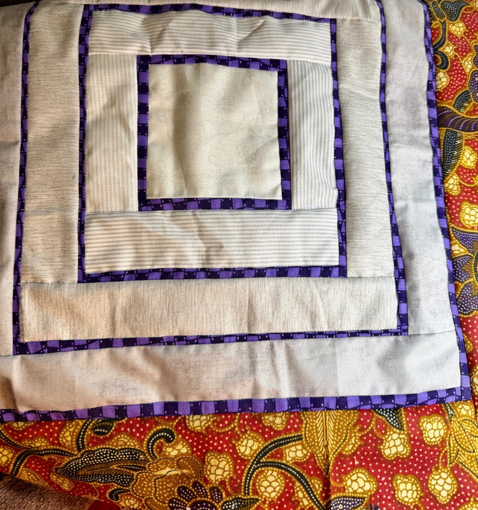 I did take a zoom class with Brandon Wulff called Biscotti Quilting. Here is the photo of a corner of my stage one piece, a log cabin with thick and thin strips. The red print to the side is a Dutch Wax Batik panel I picked up on a guild show boutique table recently. I don’t know if I took a photo of the finished log cabin – it has several borders after the red batik.