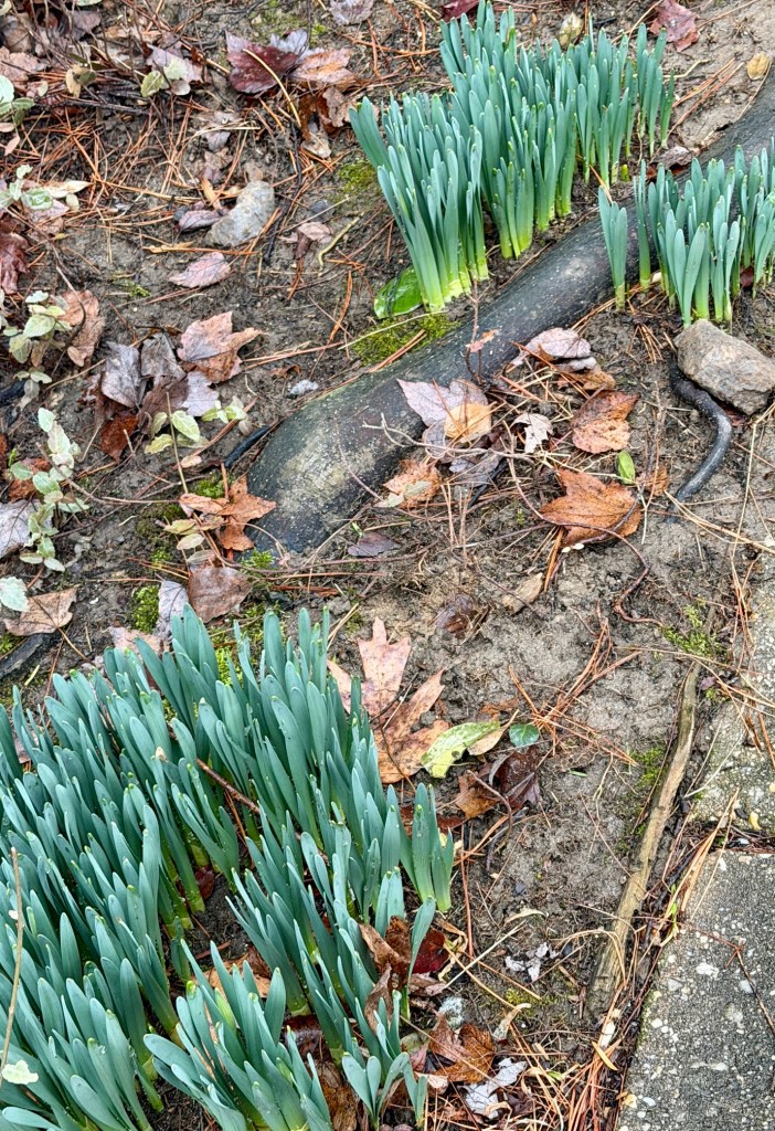 Today was lovely – warm (high 70s) and breezy. Smelled like spring – my daffodils are flowering (here they are, right after the snow shown above melted):