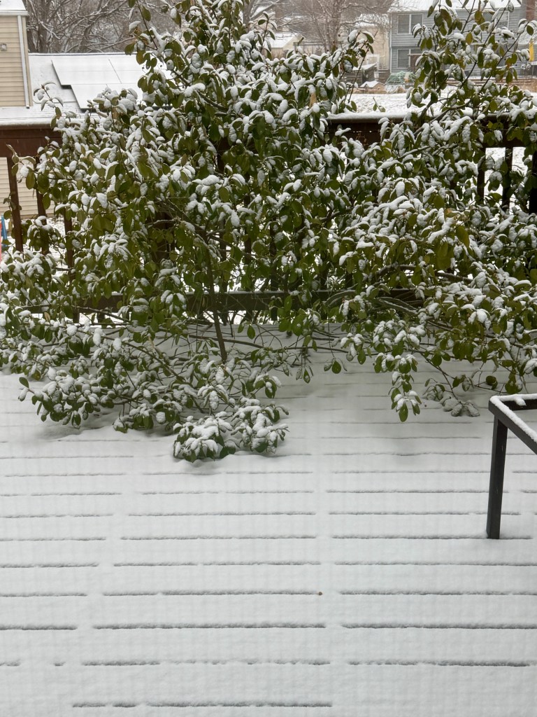 Winter here in Columbia MD is typically 40 degrees and rain – cold and dank. This year March has been all four seasons (sometimes all in one day). We have had at least two major snow falls – one with a deep layer of ice on top of the snow (strong enough to hold my weight!). There are still bits of that snow left in shadowy areas around here. The second – photo above – was softer and melted by afternoon of the same day it fell. In between we had at least one day that got up to 79 degrees!
